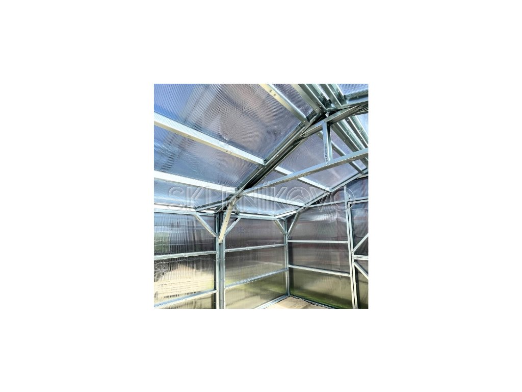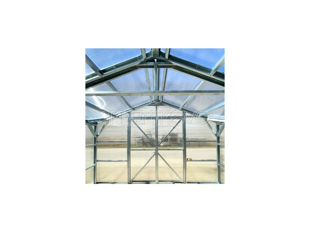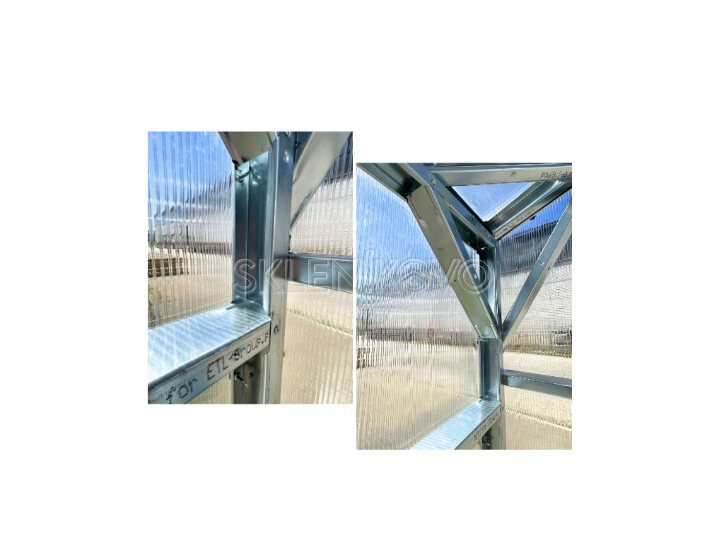 - Odolnosť voči poveternostným vplyvom – oceľové profily sú pozinkované (Z275), čo poskytuje vynikajúcu ochranu proti hrdzi. Hrubý polykarbonát na skleník s ochranným náterom zaisťuje dostatočnú tepelnú izoláciu a chráni rastliny pred škodlivým UV žiarením.